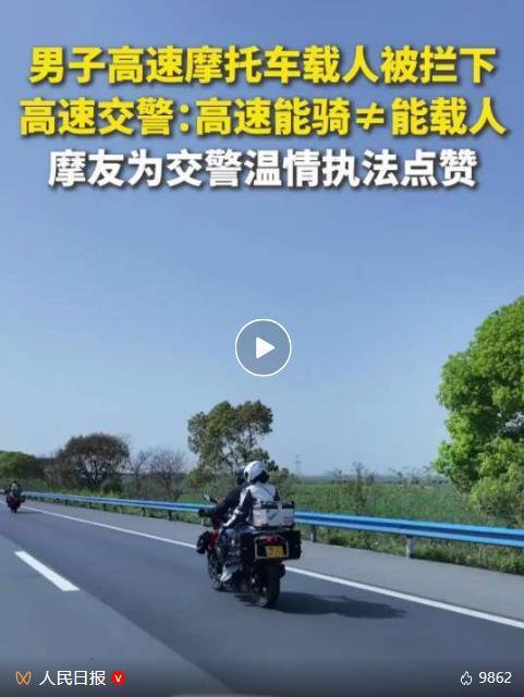两人立即拉响警笛,示意摩托车靠边:“您好,高速公路上摩托车不能载人,请靠边停车。”